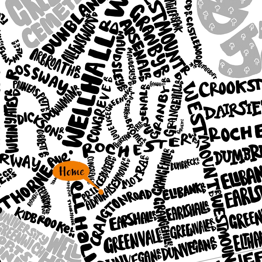 Love where you live? This typographic map uses hand drawn lettering to show all the road and green spaces in the London borough of Greenwich. It can be personalised to highlight your road, or have a colour marker pointing to your home.